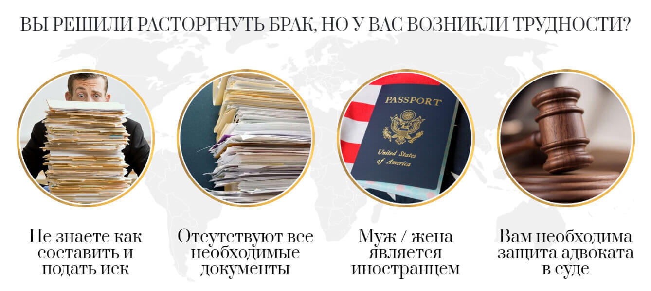 В случаях, когда возможно лишь расторжение брака через суд, семейный адвокат или хороший юрист облегчит Вам развод благодаря наиболее востребованным услугам адвоката по разводам: